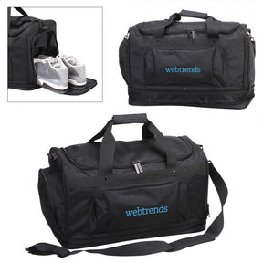 This enormous duffle bag made of tough 1680D ballistic polyester is perfect for any job! There is a large zip pocket on the front, as well as a zip pocket on the side for smaller essentials. The other side zip pocket is a shoe/ laundry compartment complete with air vents. With the spacious main compartment is also expandable by 2 ½” at the bottom to allow for even more capacity! At the bottom, there are four rubber feet to prevent the bag from being ruined. On the back, there is a webbing loop to allow the duffle bag to fit over a luggage handle. Completed with extra wide dual handles and a detachable shoulder strap.