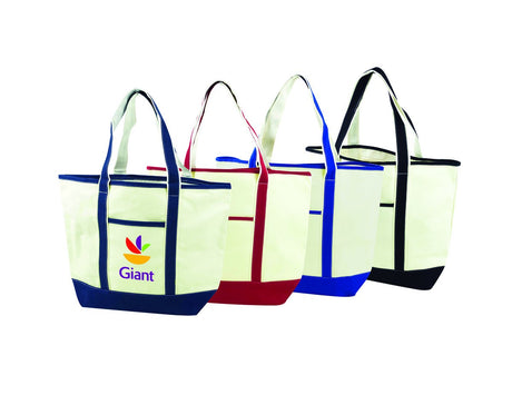 DescriptionTwo 22" handlesSpecification: Material: 13oz Cotton Canvas Size: 19"W x 12"H x 4.5"G Made of 16 oz cotton with soft PVC rope handles for comfortable carrying. It is extra wide to provide ample... Heavy Duty 15oz cotton canvas boat tote with color trim & bottom; Front open pocket; self-fabric handle. Specifications: Material: 15oz...